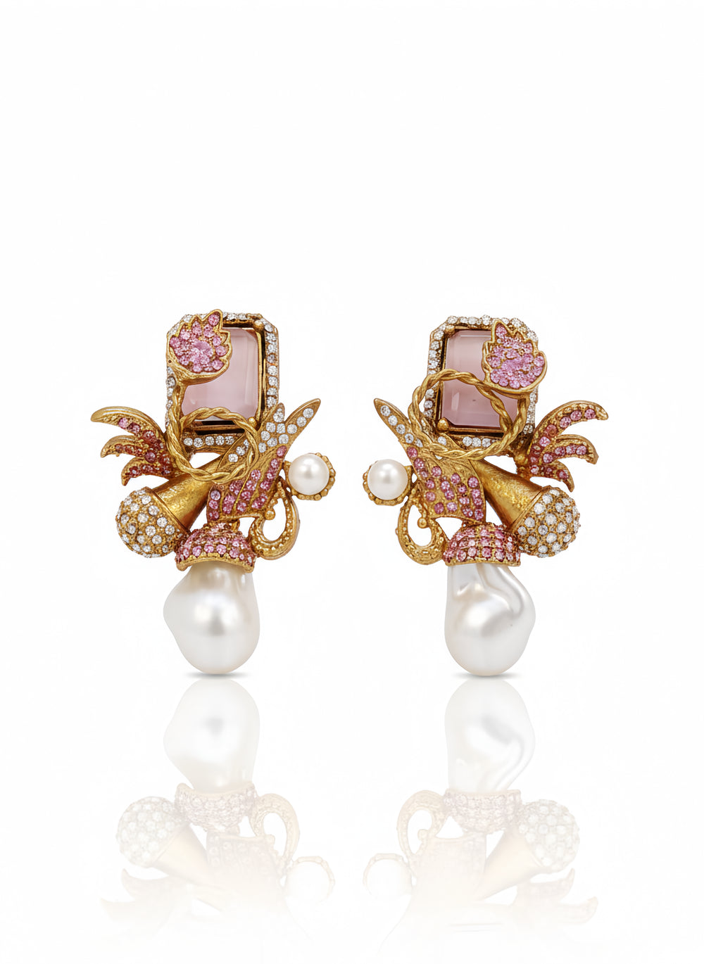 Design: An eclectic mix of floral and vine motifs surrounding a soft pink rectangular stone, finished with a signature pearl drop.
