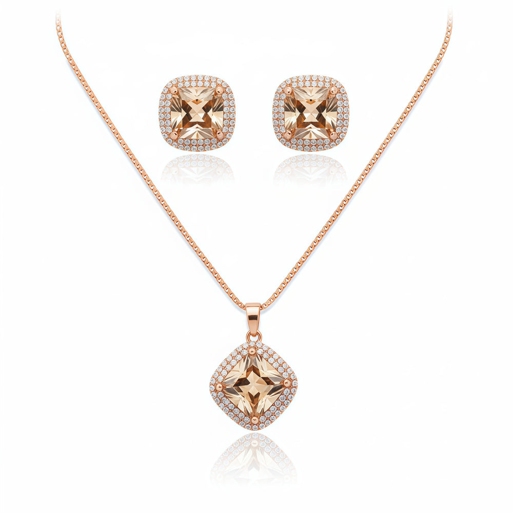 The Elegant Square Halo Pendant Set - Champagne Gold is a warm and radiant jewelry set that perfectly captures the essence of sophisticated luxury. This stunning collection features a large, brilliant princess-cut (square) champagne crystal as the focal point for both the pendant and the matching stud earrings. The soft, honey-hued glow of the central stones is beautifully accentuated by a delicate halo of shimmering pave-set clear crystals, creating a rich and harmonious aesthetic.