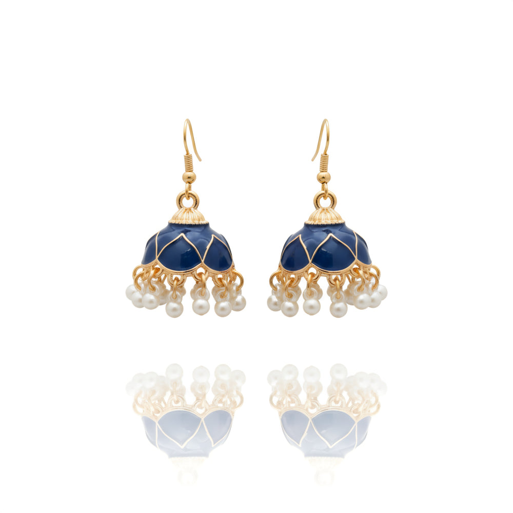 The Enamel Pearl Jhumka Earrings - Navy Blue are a timeless and sophisticated choice for your everyday jewelry box. These earrings feature a rich, deep Navy Blue enamel dome that gives them a royal and polished look. The gold geometric outlines add a subtle shine, making the deep blue color stand out beautifully.