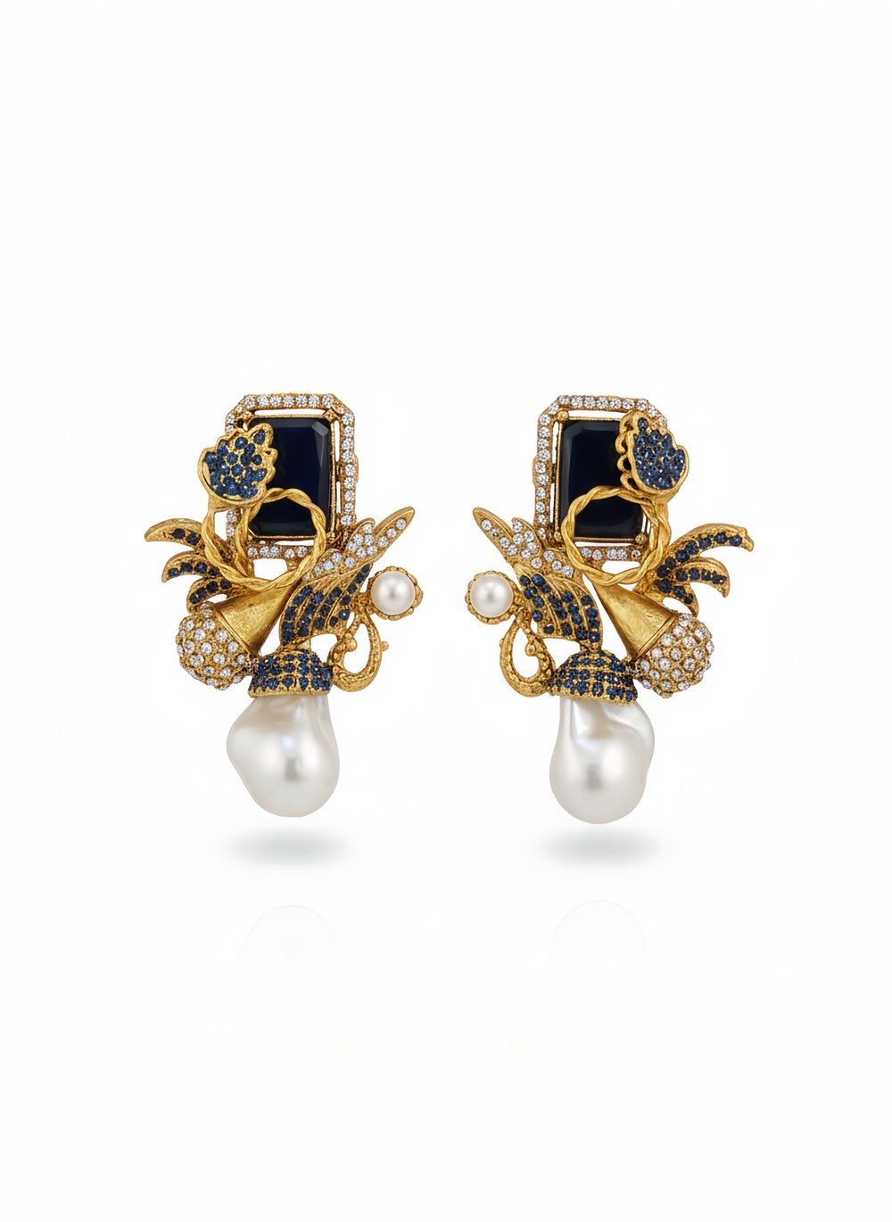 Each earring is elegantly finished with a large, uniquely shaped baroque-style pearl drop, adding a classic and sophisticated touch to the bold design. These earrings are perfect for the woman who wants her jewelry to tell a story of grace, mystery, and exceptional style.