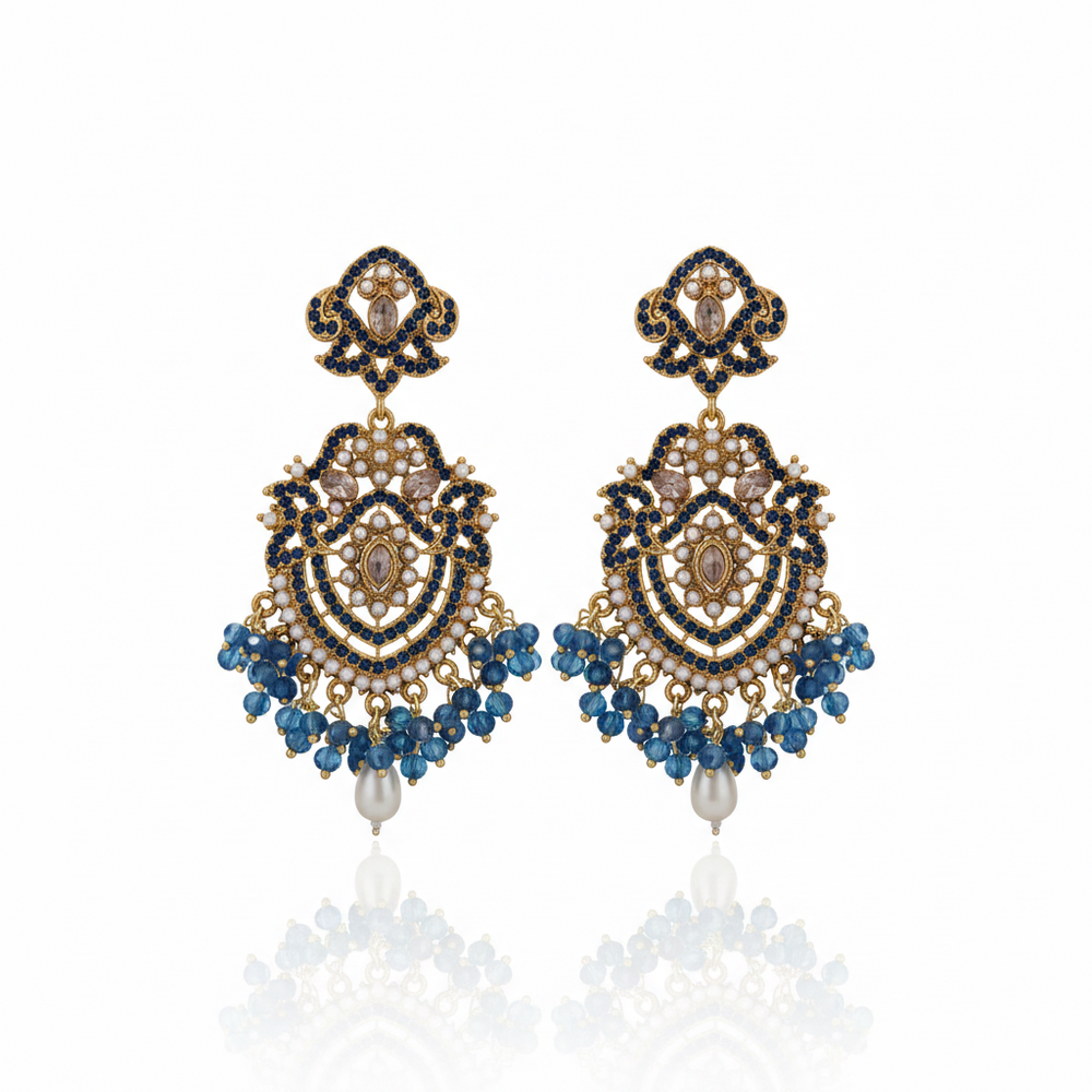 The design is finished with a graceful fringe of light blue and navy beads that sway with every movement. A central teardrop focal stone and a final, polished white pearl drop at the base complete this elegant accessory, making it a perfect choice for those who love high-contrast, jewel-toned jewelry.