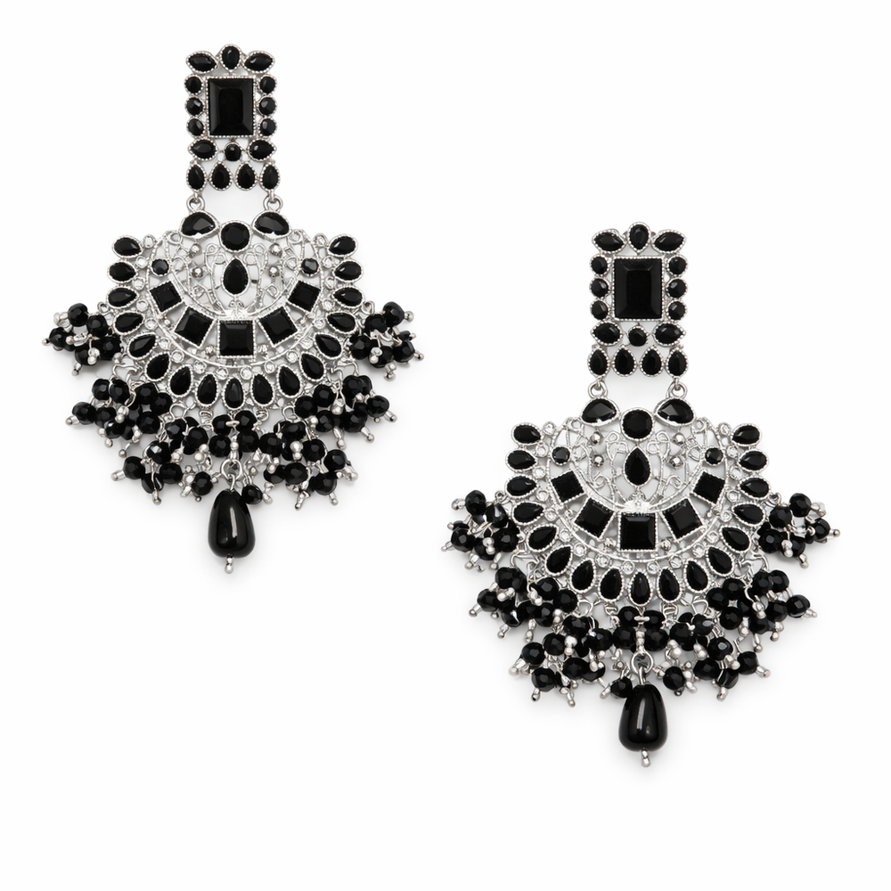 The Midnight Empress Drop Earrings – Black are made for those who love a bold, high-fashion look. These earrings have a cool silver-tone frame that is covered in tiny, sparkling clear crystals. The design is very modern and sharp, featuring deep jet-black stones in different square and teardrop shapes.
