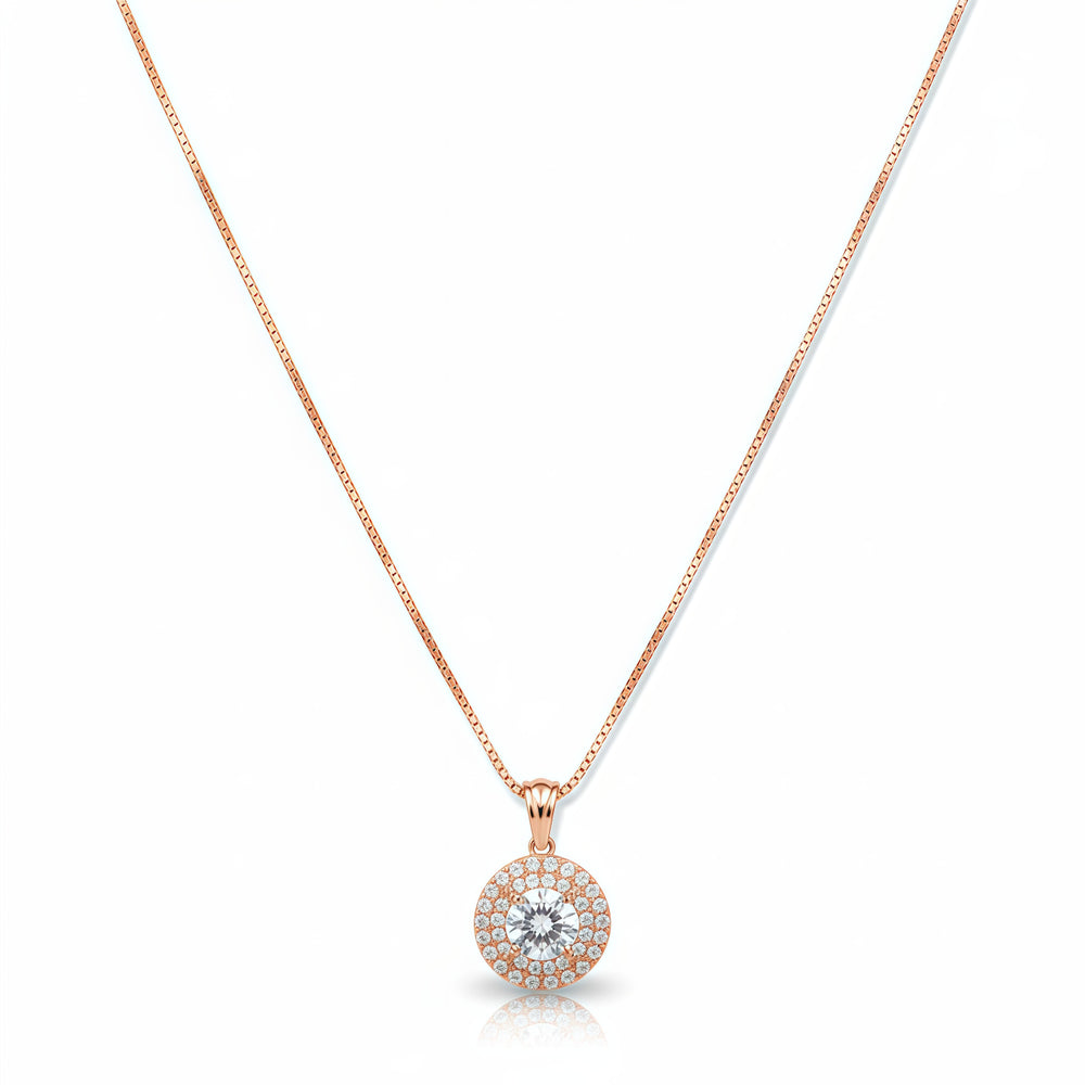 The Radiant Halo Crystal Pendant - Rose Gold is a romantic and feminine twist on a classic design. This beautiful necklace features the same brilliant round-cut clear crystal and sparkling "halo" as the silver version, but it is set in warm, blushing Rose Gold metal. The pink-hued gold contrasts softly with the bright white crystals, creating a look that is gentle, modern, and incredibly trendy.