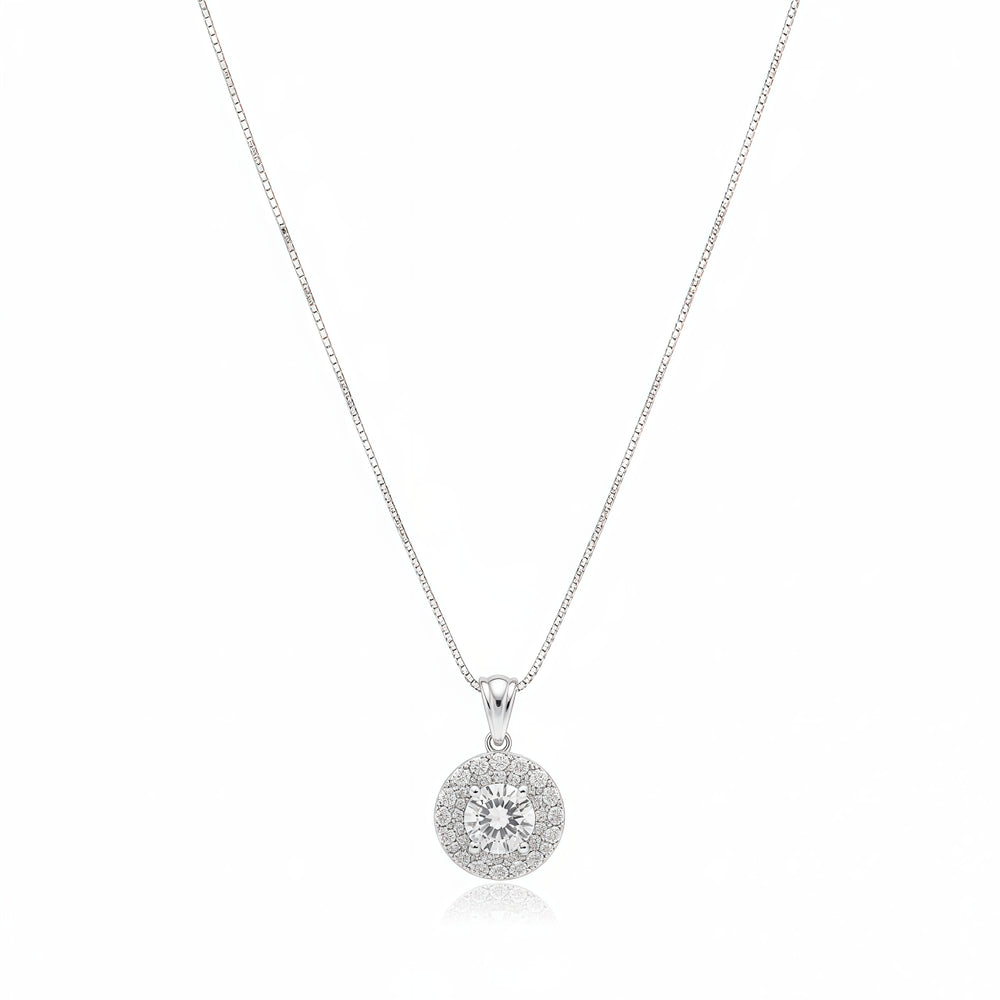The Radiant Halo Crystal Pendant - Silver is a timeless classic that exudes pure elegance. This sophisticated necklace features a brilliant round-cut clear crystal at the center, surrounded by a sparkling "halo" of smaller pave-set stones. This design technique enhances the size and shine of the central stone, giving it the luxurious appearance of a real diamond solitaire.