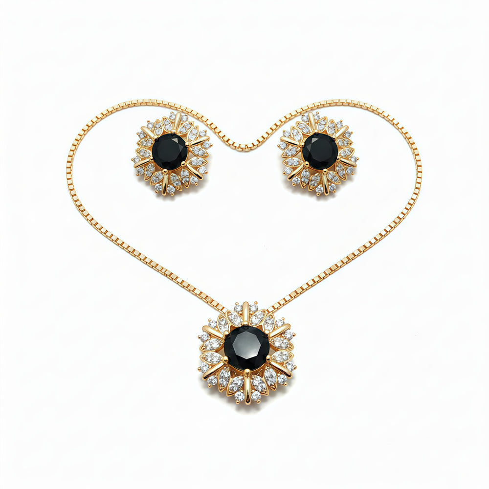 The Radiant Sunflower Crystal Pendant Set - Jet Black is a masterpiece of contrast and elegance. This sophisticated set features a bold, deep black round stone at the center of both the pendant and the matching stud earrings. The dark stone is beautifully framed by a halo of sparkling clear crystals arranged in a petal-like starburst pattern, creating a dramatic "sunflower" effect that shimmers against the gold setting.