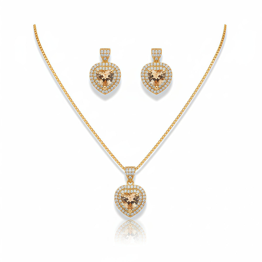 The Romantic Heart Crystal Pendant Set - Champagne Gold is an exquisite and sophisticated choice that radiates warmth and luxury. This set features a beautiful heart-shaped Champagne (light amber) stone at the center of both the pendant and the matching stud earrings. The soft, golden-tan hue of the central gem is elegantly highlighted by a double halo of sparkling clear crystals, creating a rich and harmonious glow against the gold-tone setting.